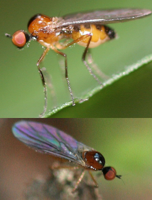 This small (4-5mm) fly is often found in forest, especialy near dung and carrion. It has very slow helicopter-like flight.