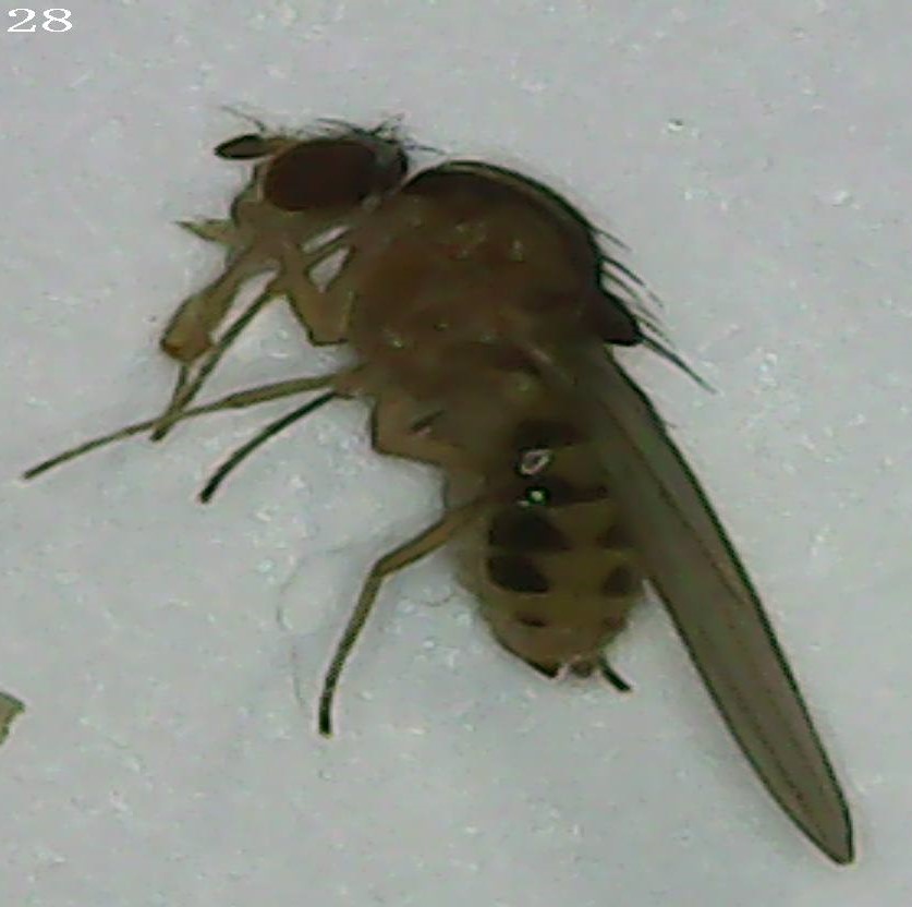 Hirtodrosophila trivittata (Drosophilidae) - was Yellowiish, dark markings, couple mm long from a f