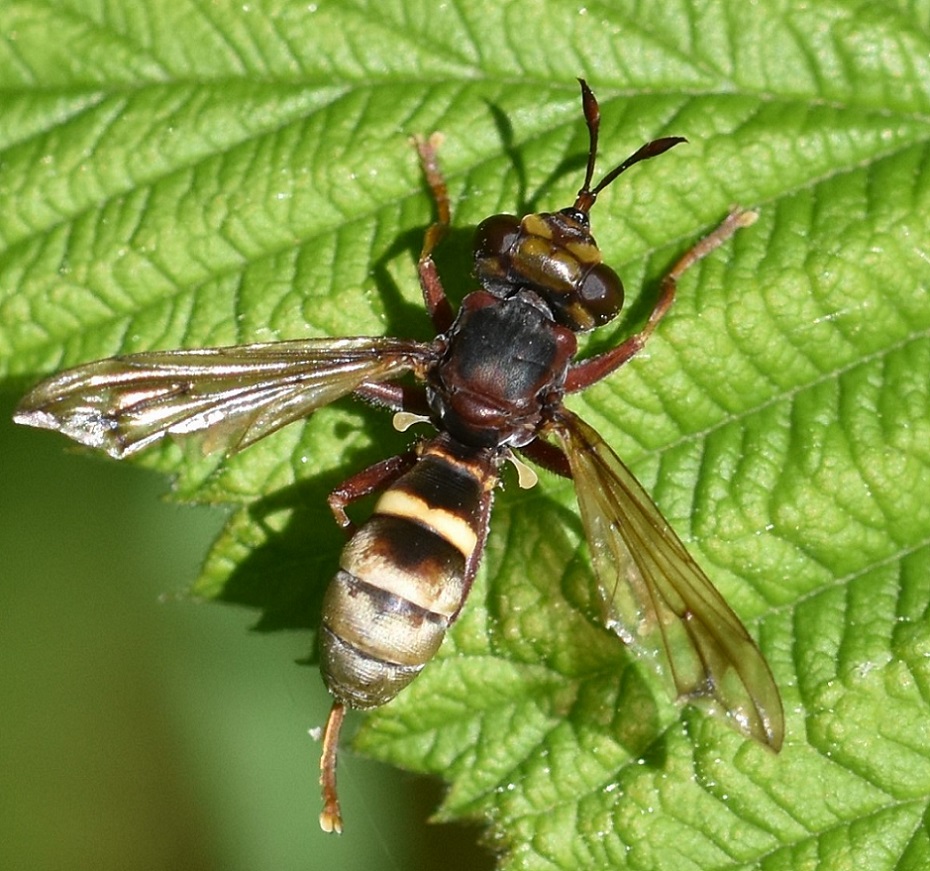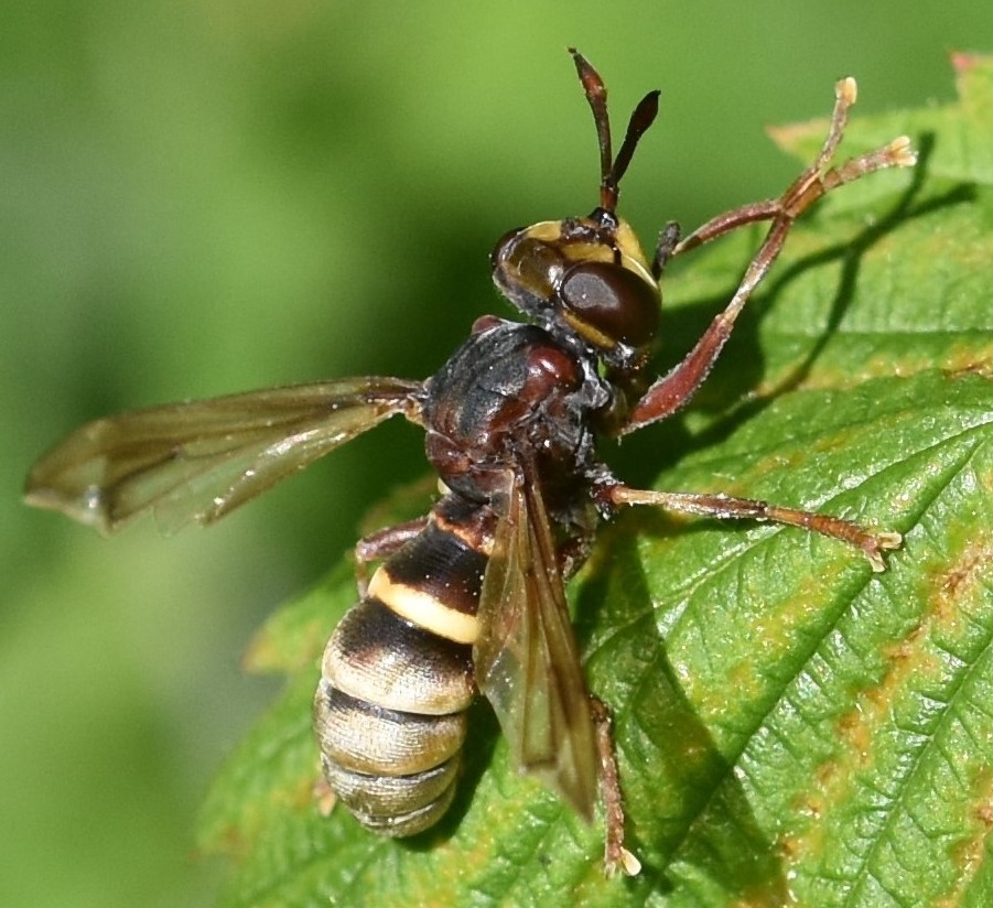 On sunlit patch near old-growth broadleaf forest, with raspberry, brambles, and hawthorn, and many large syrphids. Lisbjerg Skov, Denmark, 3 June 2020.